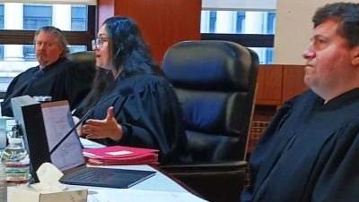Presiding Judge Sima Patel grills AP Daniel Hebel March 10 as Judges Brock Swartzle and Philip Mariani listen.