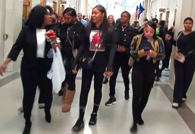 Trische Duckworth and members of Survivors Speak at the Ewing/Searcy hearing. Their shirts demand justice for Krystal Clark, dying due to conditions in the Huron Valley Women’s Prison.